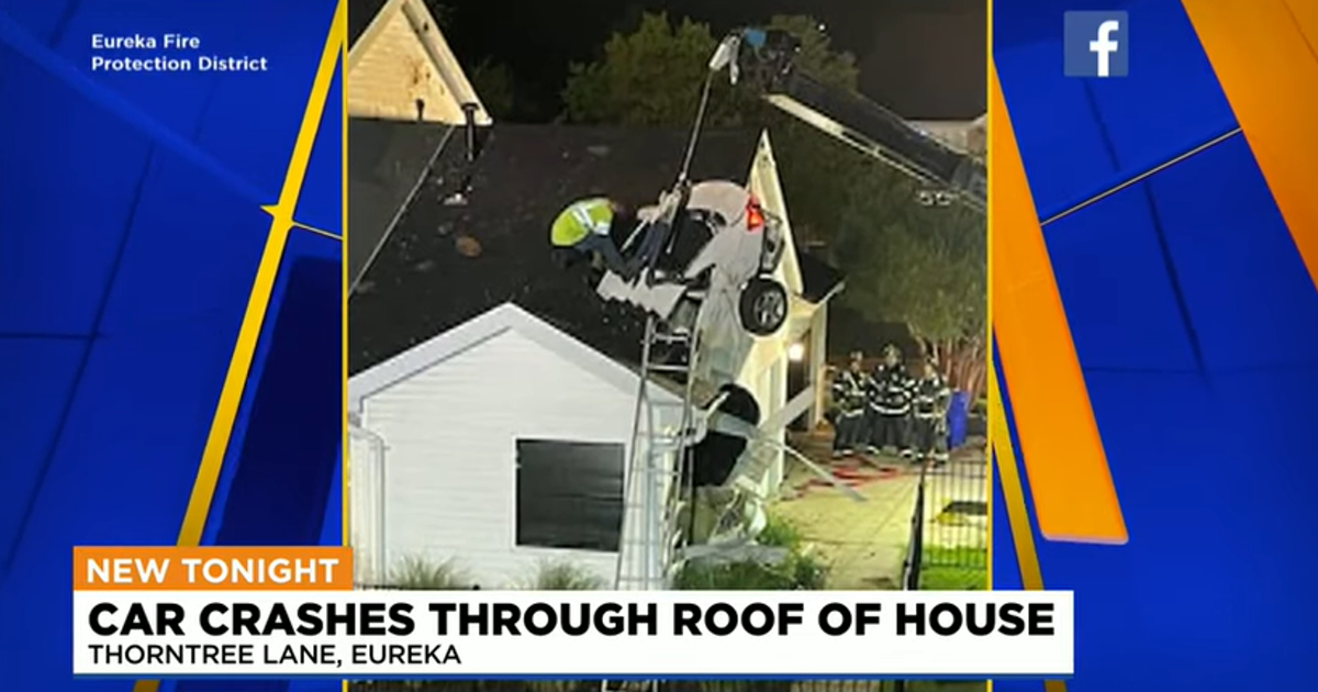В конце прошлой недели автомобиль влетел в крышу дома в Сент-Луисе, штат Миссури. Местные СМИ сообщают, что белый Chevrolet Malibu съехал с дороги и врезался в сосну.