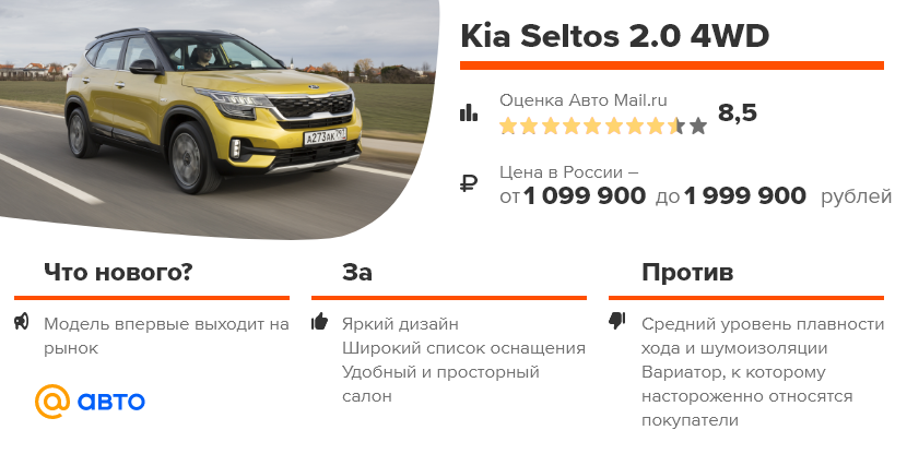 Смело заявляем, что Seltos превосходит любого конкурента из «бюджетного» сегмента, что с ценой от 1 099 000 рублей должно обеспечить ему хорошие продажи. Конечно, это будет переднеприводная машина с мотором 1.6 (123 л.с.) и механикой — они появятся у дилеров к лету. Доплата за 6-ступенчатый автомат — 40 тысяч. Полноприводный вариант с 1.6 и механикой — это уже 1 239 900 рублей, но и комплектация будет лучше.