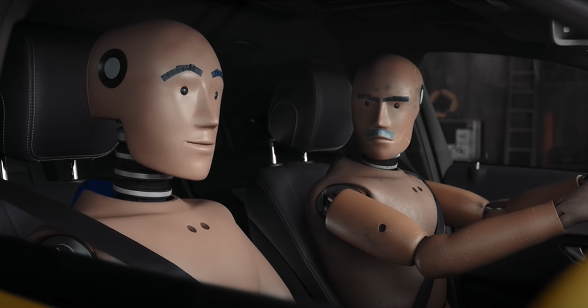 «Тормоза? Никогда в жизни ими не пользовался. Ради всего святого, я же манекен для краш-тестов. Я люблю аварии», — возмущается опытный манекен. «Не сердись, Фред, наслаждайся», — успокаивает его коллега.