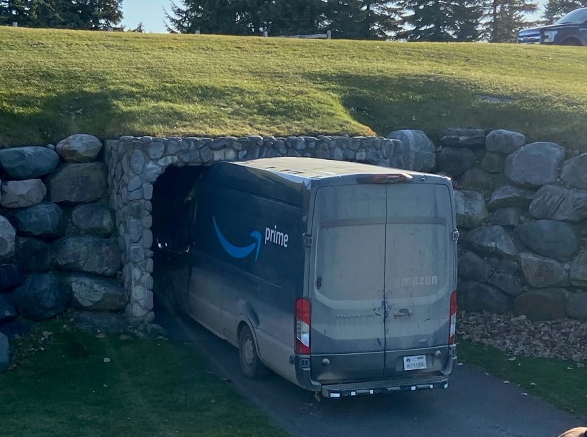 В конце прошлой недели на поле для гольфа водитель из службы доставки Amazon застрял в туннеле, который предназначен для проезда небольшим гольф-каров. Это произошло в гольф-клубе Boulder Pointe в Оксфорде (штат Мичиган, США).