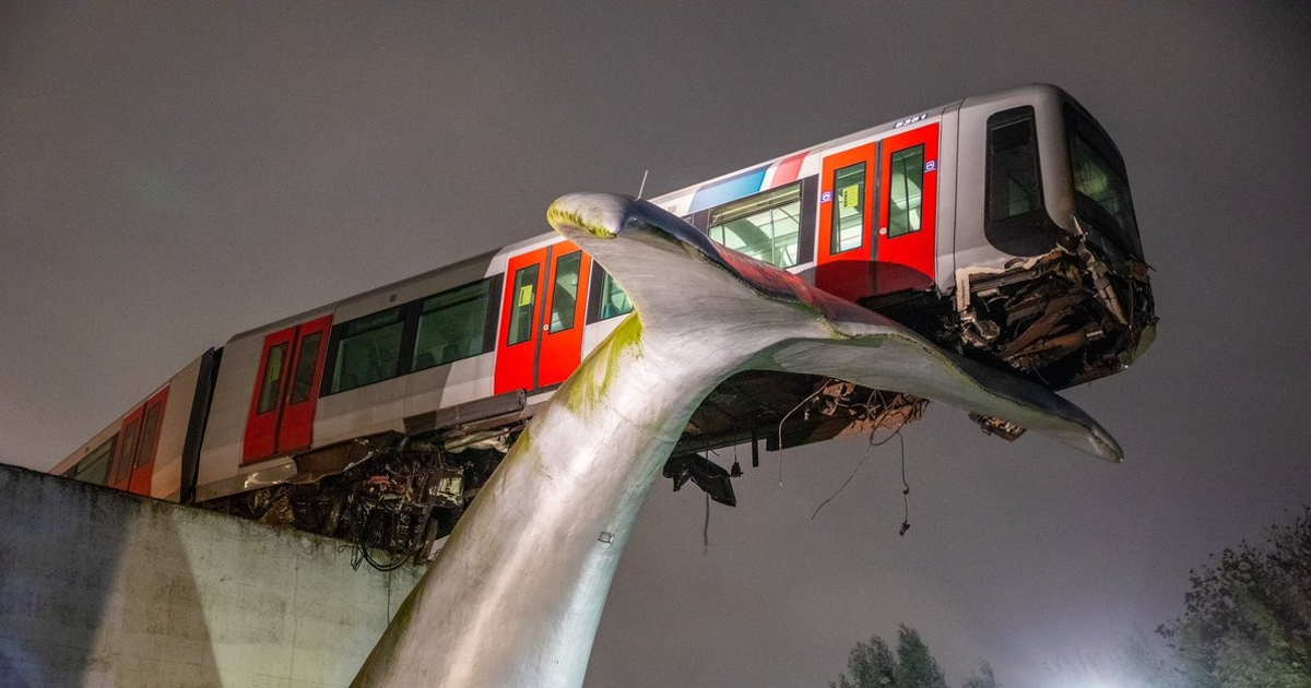 Поезд пробил ограждение и рухнул бы, если бы за станцией не оказалась бы скульптура в виде хвоста кита, ныряющего в воду. Одна из двух таких скульптур спасла поезд от падения. Он замер на «ките» на высоте почти восемь метров.