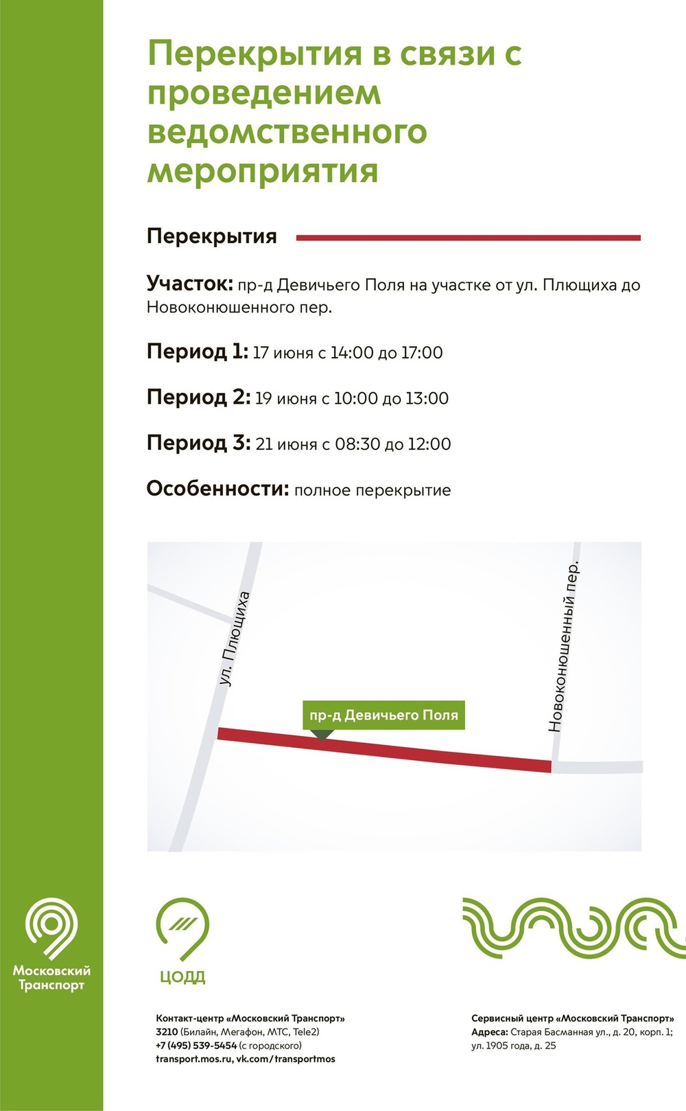 В центре города 17 июня с 14:00 до 17:00, 19 июня с 10:00 до 13:00 и 21 июня с 08:30 до 12:00 полностью перекроют движение в проезде Девичьего Поля от улицы Плющихи до Новоконюшенного переулка.