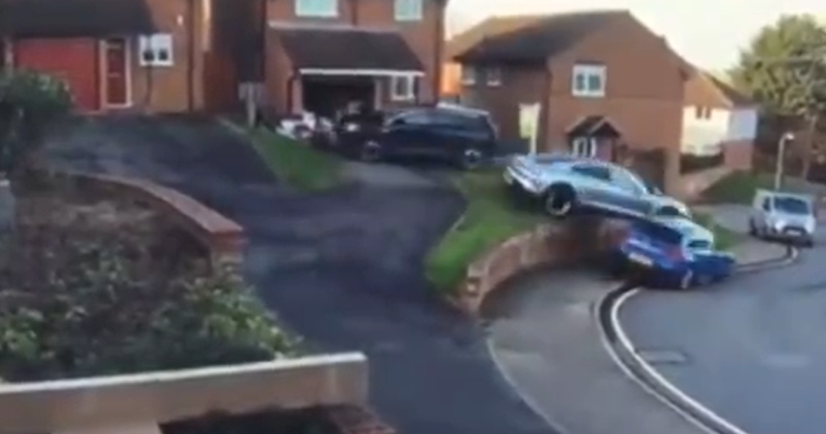 Похоже, эти динамические характеристики незадачливый водитель «Порше» испытал на себе на подъездной дорожке у дома. По каким-то причинам его автомобиль сорвался с места и врезался в черный кроссовер, а затем свалился на крышу синего автомобиля.