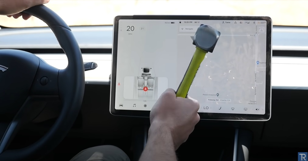 На этот раз он решил проверить на прочность центральный экран Tesla Model 3, который отвечает за управление почти всеми системами электрокара, вооружившись молотком. И провел эксперимент прямо во время движения.